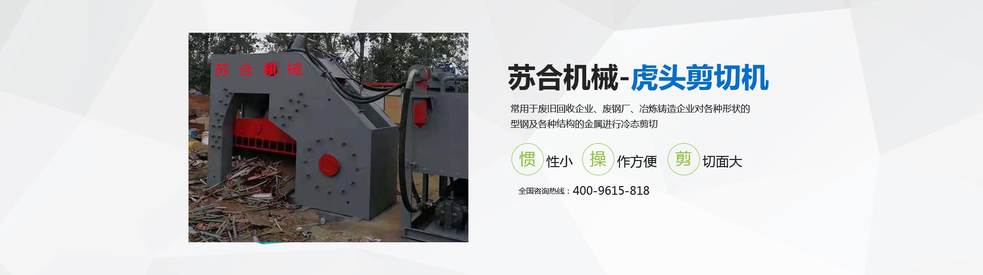 虎頭剪具有體積小、重量輕、慣性小、噪音低、動(dòng)作平穩(wěn)、操作方便、靈活、剪切斷面大、剪刀口調(diào)整方便等優(yōu)點(diǎn),操作使用安全。常用于廢舊回收企業(yè)、廢鋼廠、冶煉鑄造企業(yè)對(duì)各種形狀的型鋼及各種結(jié)構(gòu)的金屬進(jìn)行冷態(tài)剪切。剪切機(jī)的用途就是用來(lái)剪切定尺、切頭、切尾、切邊、切試樣及切除軋件的局部缺陷等。 滑縣蘇合機(jī)械制造有限公司性能穩(wěn)定,操作簡(jiǎn)單。歡迎來(lái)電咨詢 <了解更多>
